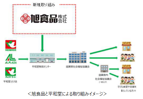 (株)平和堂(滋賀県彦根市、平松正嗣社長)は、取引先企業の旭食品(株)京都支店滋賀営業所(滋賀県東近江市、木下新平支店長)の協力のもと、新たなフードバンク活動を開始する。