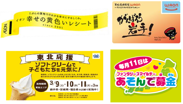 企画別では、東北応援「イオン幸せの黄色いレシートキャンペーン」が1702万9488円、「東北復興支援WAON」が434万7185円、ミニストップ「東北応援ソフトクリームで子どもたちを元気に!」が1万7396円、イオンファンタジー「ファンタジースマイルデーあそんで募金」が76万6810円の募金が集まった。