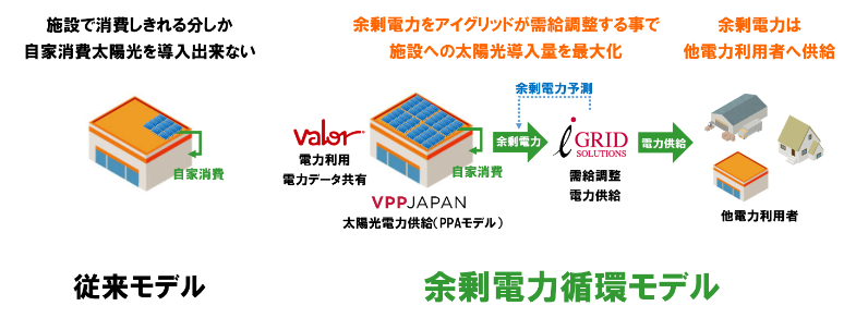 バロー、アイグリッド、VPP Japanでは、この課題を解決する「余剰電力循環モデル」の導入を2021年6 月から、ホームセンターバローで開始。施設にVPP JapanがPPAモデルで自家消費太陽光を導入し、消費しきれない太陽光余剰電力をアイグリッドが需給調整を行い、他電力利用者に供給することにで、ホームセンター、物流センター等のさまざまな施設で自家消費太陽光導入量を最大化できるようになった。このモデルでは、FIT(固定価格買取制度)を利用しないため、国内における脱FIT の持続可能な再生可能エネルギー普及を後押しするモデルになる。