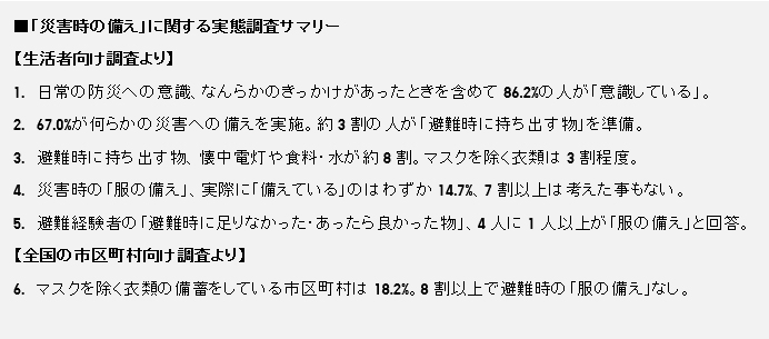 一般生活者の調査では、避難経験者の4人にひとりが「避難時に足りなかった・あったら良かった物」として「服の備え」を回答している。しかし実際に災害時の避難のため「服の備え」を行っている人はわずか14.7%だった。また、全国の市区町村における「災害時の備え」に関する調査結果から、8割以上の自治体で避難時の「服の備え」がされていない実態もあった。その理由として、食料・飲料品、新型コロナウイルス感染症対策品を優先的に備蓄しているため、衣類の備蓄ができていないという意見が多く挙げられたという。