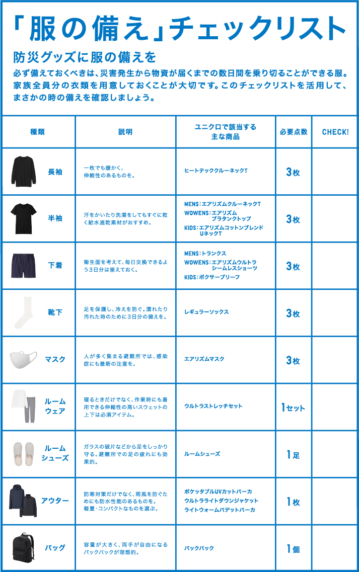 ユニクロnews|「防災の日」に向け「服の備えチェックリスト」をサイトで公開