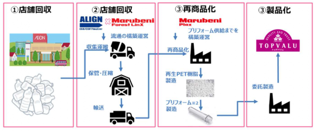 (株)アラインと丸紅フォレストリンクス(株)が使用済みペットボトルを収集・運搬し、その後の再商品化、プリフォームの製造・供給までを丸紅プラックス(株)が構築・運営する。プリフォームはペットボトルの原型のこと。
