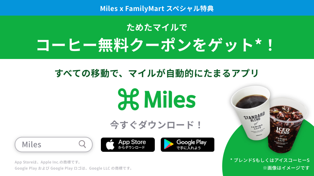 ファミリーマートではMiles Japanの環境配慮型サービスに賛同し、ローンチパートナーに参画する。特典として、Milesアプリ500マイルでブレンドコーヒーSまたはアイスコーヒーSと交換できる無料クーポンを発行する。ただし、期間限定での取り組みで、10月20日(水)~11月30日(火)で実施する。