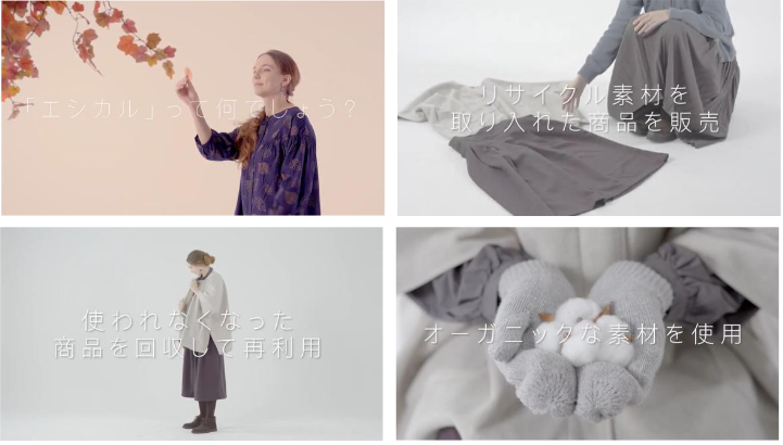 その一環として、本州のイオンなどで展開する「セルフ+サービス」の売場では2003年から衣料品の回収をスタートしている。また、イオンは、日本環境設計(株)が運営する、服の回収から再生素材を使った洋服の販売までを行う取り組み「BRING™」に賛同していて、この仕組みで回収した衣料品から再生した繊維「BRING Material™」も採用している。