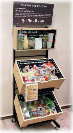 フードドライブ活動は店内に食品寄付ボックスを常設し、お客から預かった食料品と店舗での販売が困難な食料品を、支援を求めている子育て家庭や子育て支援団体、福祉施設、ひとり親世帯等へ届ける活動のこと。また、フードドライブ活動の目的を理解し、支援してもらえるよう、新たにオリジナルの食品寄付ボックスを全15店舗に設置した。