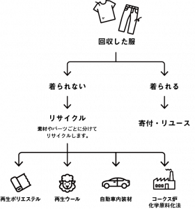 BRING™で回収された古着のうち、まだ着られる衣類は寄付される。着られないものはポリエステルの原料として、素材やパーツに分けて、何度でも続けられるケミカルリサイクルを実施している。