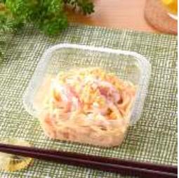 「香り箱と博多明太スパゲティサラダ」は220円(税込み、以下同じ)。明太マヨで和えたスパゲティサラダに香り箱(かに風味かまぼこ)をトッピングした。