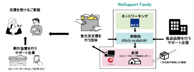 オイシックス・ラ・大地(株)(東京都品川区、高島宏平社長)、一般社団法人RCF(東京都新宿区、藤沢烈代表理事)、ココネット(株)(東京都中央区、達川巨鳳生社長:セイノーホールディングスグループ)が連携して運営する「We Support」(高島宏平代表)は、ひとり親世帯を中心とした子どものいる困窮家庭に向けた食品支援のプロジェクト「We Support Family」の活動を12月15日(水)から開始した。まず東京都と埼玉県内の6団体への支援から始める。