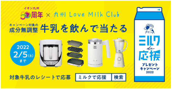 イオン九州(株)(福岡市博多区、柴田祐司社長)は、九州生乳販売農業協同組合連合会(九州Love Milk Club、福岡市博多区、中村隆馬代表理事会長)と、1月7日(金)から2月5日(土)までの期間、「ミルク de 応援 プレゼントキャンペーン2022」を実施する。