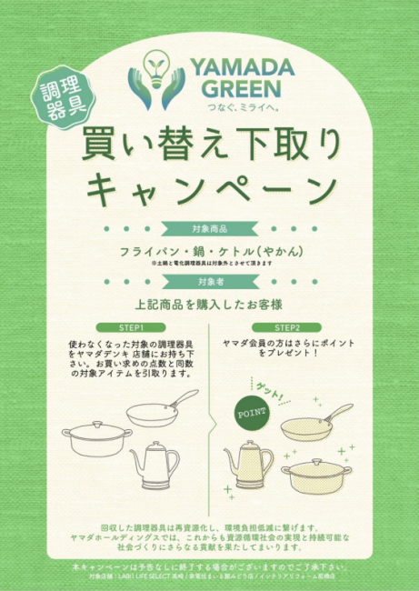 下取りキャンペーンの対象店舗は群馬県内の「LABI1 LIFE SELECT高崎」、「家電住まいる館 YAMADAみどり店」、「インテリアリフォームYAMADA 前橋店」の3店舗。同キャンペーンでは購入点数と同数のフライパン、鍋、やかんなどの使わなくなった調理器具を顧客から引き取る。