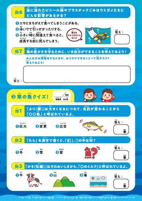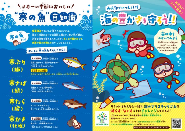 6月の「環境月間」、10月30日の「食品ロス削減の日」に続き、 第3弾として1月19日(木)からの「今がおいしい寒の魚」セールに合わせ、海のプラスチックごみ問題や「寒の魚」の豆知識をテーマにしたリーフレットを1月24日までの期間、 サミットストア全店(神田スクエア店を除く)で配布する。