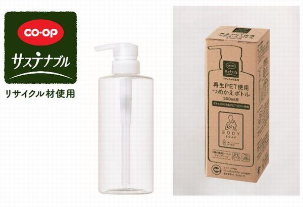 新商品「CO・OP 再生PET使用 つめかえボトル 500ml用」は再生樹脂をボトル部分に100%使用したエコマーク認定商品。外箱も環境に配慮し、FSC認証紙を使用している。