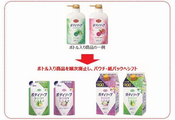 現在、パウチや紙パックに入ったつめかえ用のボディソープなどが広く組合員に利用されているが、今後は「CO・OP ボディソープ」などボトル入り商品を順次廃止していく。一部商品を除いて、パウチや紙パックに入ったつめかえ用商品に徐々にシフトする。「CO・OP ボディソープ」のボトル入り商品廃止によって、年間約4.1トンの石油由来プラスチックを削減することができる。
