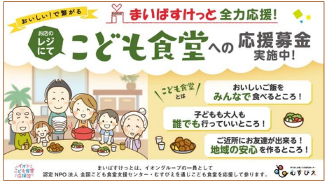 同社で集まった募金とイオングループ各社で集まった募金を合わせた総額284万3945円を、NPO法人全国こども食堂支援センター・むすびえに寄付する。募金は、全国各地のこども食堂の活動に使用される。