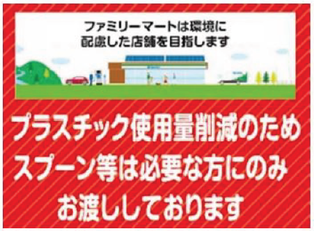 4月1日(金)から、レジカウンターで、プラスチック製カトラリーの使用抑制を啓発するための、ファミリーマートオリジナル掲示物を掲示する。3月22日(火)からは店内放送で、4月1日(金)からはレジ液晶画面でも、啓発のための案内を行う。