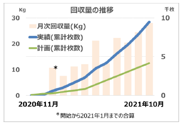 2020年10月30日~2021年10月末の約1年間に、フィルム容器約9500枚を回収した。これは計画に対して約2倍の回収量となった。