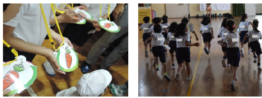 食品ロス学習では、ハウス食品グループ本社とフードロス・チャレンジ・プロジェクトが共同開発したプログラム「もったいない鬼ごっこ」を活用し、どのように食品ロスが発生しているのか、どうすれば食品ロスを防いだり、減らしたりすることができるのかを、児童自身が食べ物になりきって鬼ごっこをしながら学んだ。ゲーム終了後には「食品ロスを減らすために何ができるか」を話し合った。「好き嫌いをしない」「買物するときは手前から取る」「自分が食べられる分だけお皿によそう」などさまざまな意見が飛び交った。