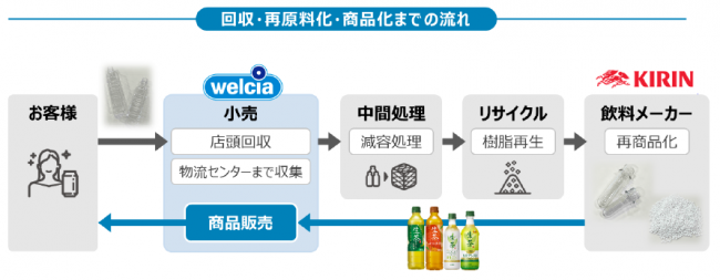 この実証実験は、ウエルシアが店頭に設置した回収ボックスで使用済みペットボトルを回収し、分別する。それをキリンビバレッジがリサイクラーに供給したうえで再原料化して再生PET樹脂を製造し、その再生PET樹脂を使用した容器に入れた飲料を製造する。キリンビバレッジはこの一連のリサイクル工程を管理する。
