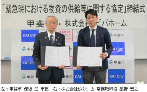 (株)ビバホーム(さいたま市浦和区、坂本晴彦社長)は3月25日(金)、山梨県甲斐市と「緊急時における物資の供給等に関する協定」を締結した。