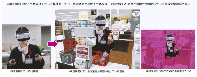 2020年12月から一部店舗において、約5000名の従業員を対象にレジ操作や接客基本応対などの入社教育をVRで行う実証実験を実施した。一般的に、VRを活用すると、実際の機器がなくてもVR上でレジ操作をしたり、お客がいなくてもVR上で応対をしたりするなど現場で“体験”している感覚で学習できることや、没入感が高く集中して学習でき、学習定着率が非常に高くなると言われている。体験後のアンケートでは約9割が「テキストや動画での学習より作業手順の理解が深まった」「事前に体験できることで自信をもって売場に立てる」「何より楽しく学習できた」と回答している。