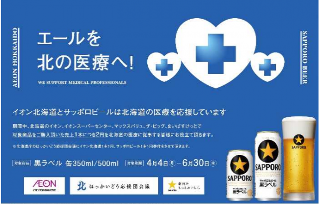 この企画は昨年実施した共同企画の第2弾。期間中の「サッポロ生ビール黒ラベル」の販売数量に応じ、1缶につきイオン北海道(株)から1円、サッポロビール(株)から1円の計2円を、北海道が実施する地域医療を守るための寄付プロジェクト「エールを北の医療へ」に寄付を行う。