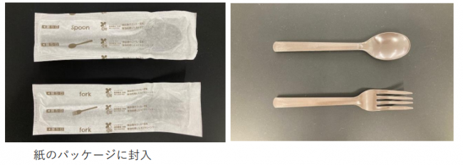 今年4月から施行された、「プラスチック資源循環促進法」への対応として、カトラリーを、バイオマス配合品や紙素材のものに変更している。