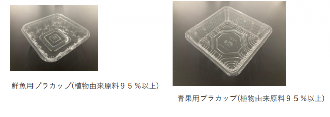 鮮魚売場の珍味コーナーと青果売場の果物コーナーで、植物由来原料95%以上のプラカップを一部導入している。