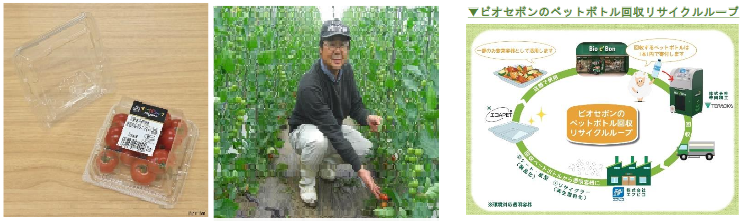 一つは回収したペットボトルを店内の惣菜トレーとして再利用する試み。2020年11月から取り組んでいる。ビオセボンの「ドネーション参加型のペットボトル回収機」で回収した資源は、(株)エフピコのリサイクル工場で原料に戻し、「エコAPETⓇ」トレーにリサイクルされる。このリサイクルトレーを、新たに「北海道洞爺湖町産佐伯農園ミニトマト200g」に採用する。これにより従来使用していた資材に比べ約30%のCO2排出量削減を見込む。