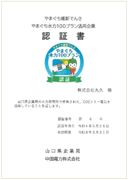 (株)リテールパートナーズ(山口県防府市、田中康男社長)は、「やまぐち維新でんき~やまぐち水力100プラン~」認証書の交付を受け、子会社の丸久のスーパーマーケット店舗で水力プランを導入する。