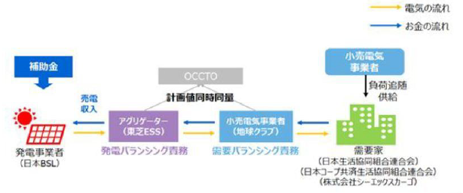 運転開始後は、東芝ESSが再エネBGを構成し、この発電所で発電された再エネ電力を固定価格で買い取り、地球クラブを通じて日生協をはじめとした需要家に再エネ電力を供給する。再エネBGは、計画と実績のインバランスを積算する事業者集団。