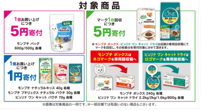 「モンプチ バッグ 600g/500g 各種」は1個購入につき5円寄付。「モンプチ ナチュラルキッス 40g 各種」「モンプチ プチリュクス ナチュラル パウチ 30g 各種」「モンプチ ワン キャット パウチ 70g 各種」は1個購入につき1円寄付。「モンプチ ボックス 240g 各種」「ピュリナ ワン キャット ドライ 2.2 ㎏/2 ㎏/1.6 ㎏/800g 各種」はマーク1枚につき5円寄付。
