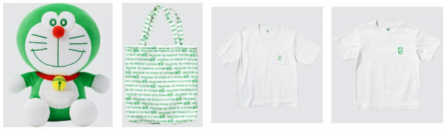 新商品の「ドラえもんサステナモード」は、トイ(ぬいぐるみ)が1990円(税込み、以下同)、ポケッタブルバッグが990円、クルーネックTシャツ 1色柄が1500円、KIDSクルーネックTシャツ 1色柄が990円。いずれもリサイクルポリエステル100%で、トイ(ぬいぐるみ)はペットボトル約14本分、ポケッタブルバッグは約5本分、クルーネックTシャツ 1色柄 は約24本分、KIDSクルーネックTシャツ 1色柄 は約13本分を使用している。