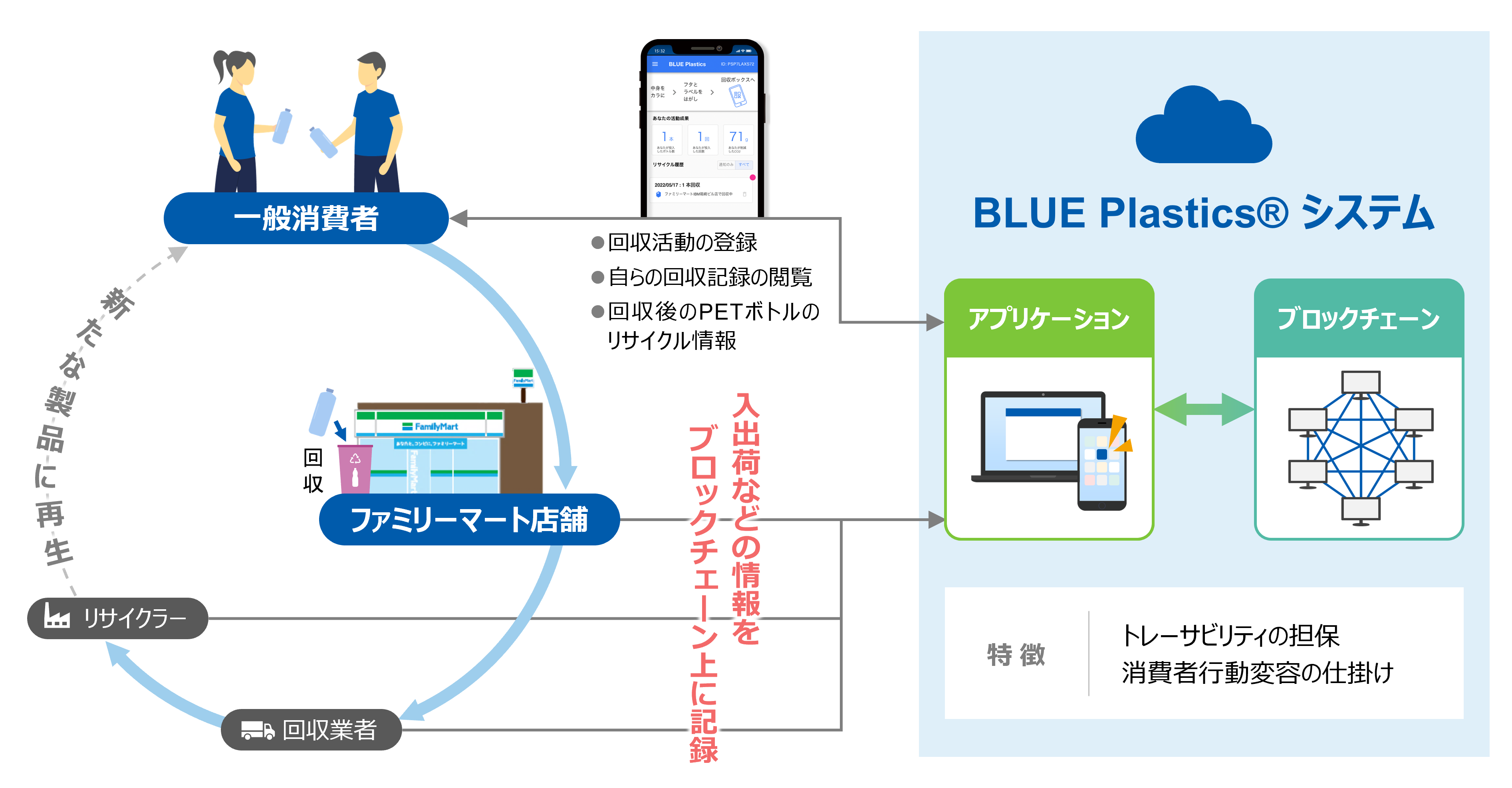 実験では、消費者にファミリーマートの店頭に設置された回収箱に、使用済みPETボトルを投入してもらう。その際、回収箱に印字された二次元コードをスマートフォンで読み取り、投入したPETボトルの本数をアプリ上で登録させる。これにより消費者は、ブロックチェーン技術のトレーサビリティによって、自分が投入したPETボトルが回収後にリサイクルチェーンのどのプロセスにあるのかを確認することができるというもの。