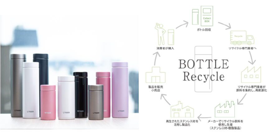 回収したステンレス製ボトルは、リサイクル専門業者へ集約され、集まったリサイクル原料から再生ステンレス材と再生樹脂製品が生産される。再生ステンレス材は新たな製品へ生まれ変わり、再生樹脂製品はタイガー魔法瓶の各生産工場で活用される。モノを消費・使い捨てするのではなく、再資源化することで、環境負荷低減と持続可能な経済成長を両立させる “サーキュラーエコノミー(循環型経済)” の実現を目指す。
