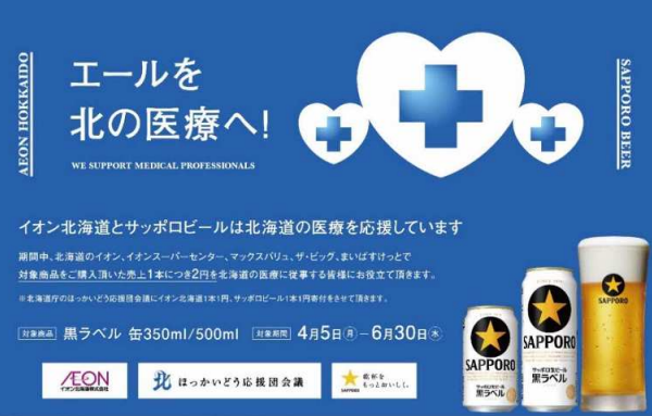 イオン北海道(株)(札幌市白石区、青栁英樹社長)とサッポロビール(株)は7月21日(木)、「サッポロ生ビール黒ラベル」の売上げの一部を、北海道が実施する地域医療を守るための寄付プロジェクト「エールを北の医療へ」に寄付すると発表した。