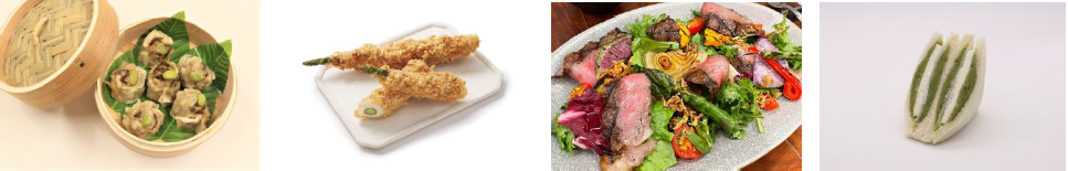 左から「夏さっぱり!塩こんぶと枝豆のおつまみシューマイ」6個入で810円(税込み、以下同じ)、「三元豚アスパラ肉巻き」1本420円、「雪降り和牛ステーキサラダ仕立て(肉100g)」1食3500円、「ずんだクリームチーズ大福生クリームサンド」1袋410円(税込み、以下同じ)。