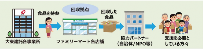 現在、大東建託は、全事業所に防災用備蓄品を備えている。そのうち、各事業所が保有する防災用備蓄食品について、定期的な入れ替えにより発生する余剰食品を有効活用するため、「ファミマフードドライブ」を実施する最寄りのファミリーマート店舗に寄付する。寄付した食品は、それぞれの地域で活動するNPO団体や社会福祉協議会などを通じて、食支援が必要な人に届けられる。