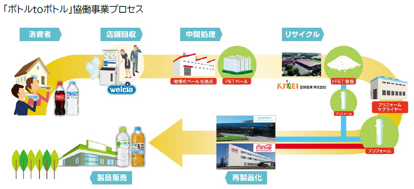 今回、この実証実験の結果を踏まえ、さらなる「ボトル to ボトル」普及に向け、コカ・コーラ ボトラーズジャパンとサントリーが掲げているボトルtoボトルを含むPETボトルの100%サステナブル素材化の取り組みに協働して取り組む。店頭で回収したPETボトル回収量は、(株)アライン(東京都千代田区、遠藤正浩社長)と共同開発したトレーサビリティーシステム「Pet BtoB Net」により可視化できる。回収量の全量を把握したうえで協栄産業によりメカニカルリサイクルされ、コカ・コーラ ボトラーズジャパンとサントリーのPETボトル資源原料として供給される。