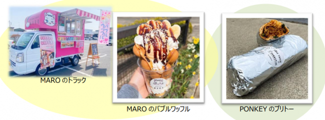 ウェルビーイングフードトラックフェスタでは、人気のフードトラックMARO(マロ)とPONKEY(ポンキー)が食事を提供する。MAROは、グルテンフリーのバブルワッフルを提供する。PONKEYは、フードロスをなくす取り組みをしており、“規格外“などを理由に普段廃棄されてしまう食材を使った美味しいブリトーと、植物性の材料のみを使用したスムージーを提供する。