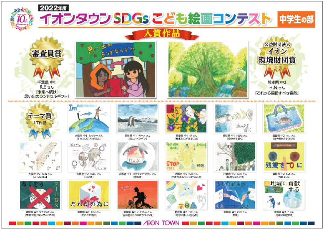 イオンタウンでは、昨年9月1日、会社誕生から10周年を迎えたことを機に、未来に向けてSDGsへの取り組みを強化すべく、「SDGs宣言」を策定した。そして、SDGs促進・普及に貢献する活動として、全国の小・中学生を対象に「イオンタウンSDGsこども絵画コンテスト」の作品を募集した。430作品の審査が行れ、小・中学生各19名の作品が入賞した。審査員はイラストレーターのBoojil氏、フリーアナウンサーの魚住りえ氏、公益財団法人イオン環境財団の山本百合子専務理事、イオンタウンの加藤久誠社長。表彰式は、審査員と入賞者をオンラインで結び、受賞者のコメントや審査員からの講評、写真撮影などを行った。
