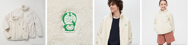 「ファーリーフリースフルジップジャケット(長袖)」「フリースフルジップジャケット(長袖)」「ドラえもん サステナモード ファーリーフリースフルジップジャケット」「ドラえもん サステナモード クルーネックTシャツ(半袖)」