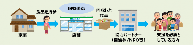 店頭に設置した回収ボックスで食品を預かり、協力パートナーへ渡す。協力パートナーは、地域で支援が必要な人や団体へ寄贈する。回収頻度、食品寄贈先は協力パートナーによって異なる。