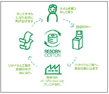各店舗の「バス・トイレタリー」売場に回収ボックスを設置して不要になったタオルを回収する。回収されたタオルは、製造工程で出る廃材やバージンコットンとブレンドして再生した糸で新しいタオルをつくる。回収の対象となるのは、綿100%のタオルのみ。