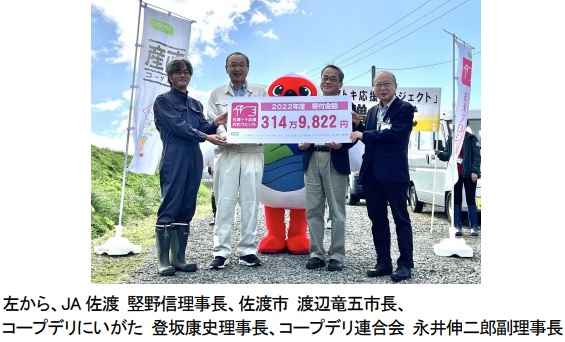コープデリ生活協同組合連合会(埼玉県さいたま市、土屋敏夫理事長)はと会員生協(関東信越の6生協)は、佐渡市が進める環境に配慮した農業(生物多様性農業)の推進やトキの野生復帰支援のための活動「佐渡トキ応援お米プロジェクト」で集まった寄付金314万9822円を、佐渡市に寄付した。
