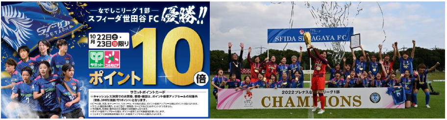 サミット(株)(東京都杉並区、服部哲也社長)は、スポンサー契約をするスフィーダ世田谷FCが、「2022年なでしこリーグ1部」で初優勝を果たしたことを記念して、10月22日(土)、 23日(日)の2日間、ポイントアップセールを実施する。
