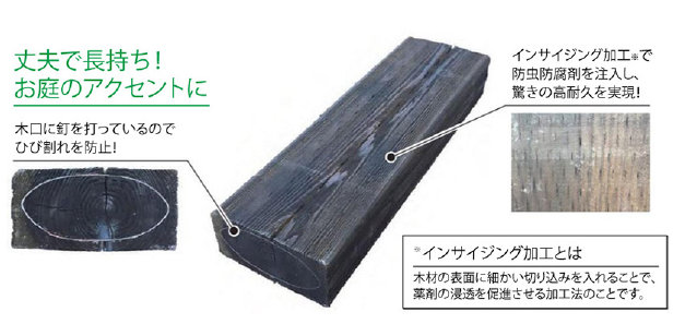 「立てる」「敷く」「積む」という3通りの使い方ができる。凹凸、毛羽立ちなどのヴィンテージ加工を施し、ダークブラウンに塗装したことによって和風の庭・洋風の庭のどちらにもマッチする。また、防虫・防腐加工を施し、木口には割れ防止の釘を入れることで、施工後の形状変化を防止し、10年以上の耐久性を確保した。
