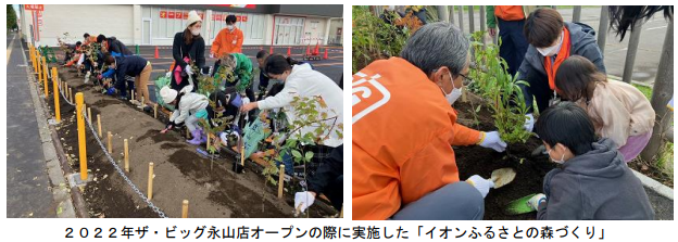 イオンでは1991年以降、新店オープンの際、敷地内に顧客と一緒に木を植える「イオン ふるさとの森づくり」を行っている。「店舗が地域に根ざし、地域のコミュニティの場となること、さらには緑を育む心が世界に広がるように」といった願いを込めて実施するイベントとなっている。