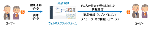 「脳にいいアプリ」ユーザーのうち、例えば血圧が高めの人や日々の歩数が少ない人に向けて、その人に合った、セブン‐イレブンのおすすめ商品やデニーズのおすすめメニューを提案する。