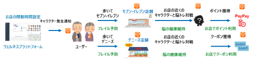 該当の八王子市内のグループ店舗で、AIキャラクターと脳トレ対戦ができる。対戦に勝った場合、セブン‐イレブンでは「てくポ」を付与し(アプリ内でPayPayに変換可能)、デニーズでは店舗で利用できるクーポンを贈呈する。