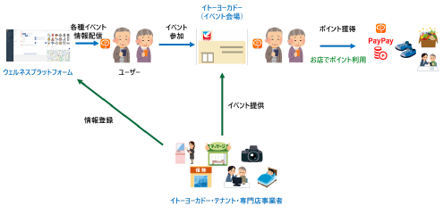 この実証実験は産官学連携の持続可能な健康ポイントICTサービスの領域において、 日本初の試み。ICTサービス(通称:てくポ)と「健康に資する商品・サービスを展開する事業者」をつなぐことで、「ウェルネスプラットフォーム」を実現する。